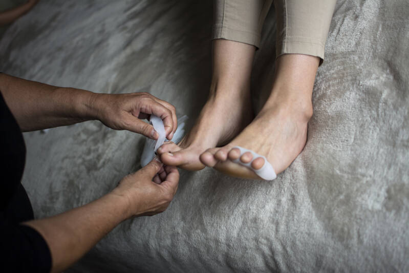 - Forceer of trek niet onnodig aan het materiaal. Het product moet als het ware de teen, voorvoet en/of hiel omarmen.